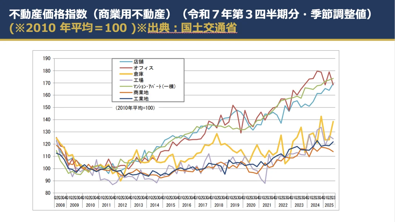 商業用不動産も同様である。商業用不動産総合指数は147.2で前期比1.1%上昇となっており、全体として底堅さが見られる。ただし、強いのは一棟マンションや店舗系であり、オフィスは住宅ほどの上昇が確認しにくい。外国人投資家にとっては、単に商業用不動産という括りではなく、何が収益を生み、何が出口を描きやすいかを分けて考える必要がある。