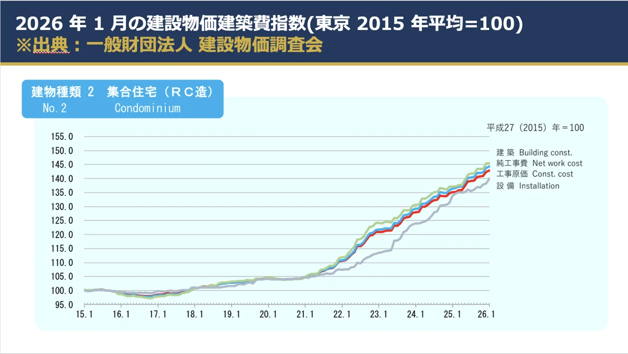 建築着工統計でも、新設住宅着工戸数の減少が確認されており、貸家、持家、分譲住宅のいずれも弱い。特に分譲マンションの供給減速は、今後も既存の中古マンション価格を支える要因になりやすい。外国人投資家にとっての示唆は明確で、新築が高く、供給が出にくい局面では、既存の流動性が高い住宅に資金が集まりやすいということである。今月はまさに、その構図がより鮮明になった月といえる。