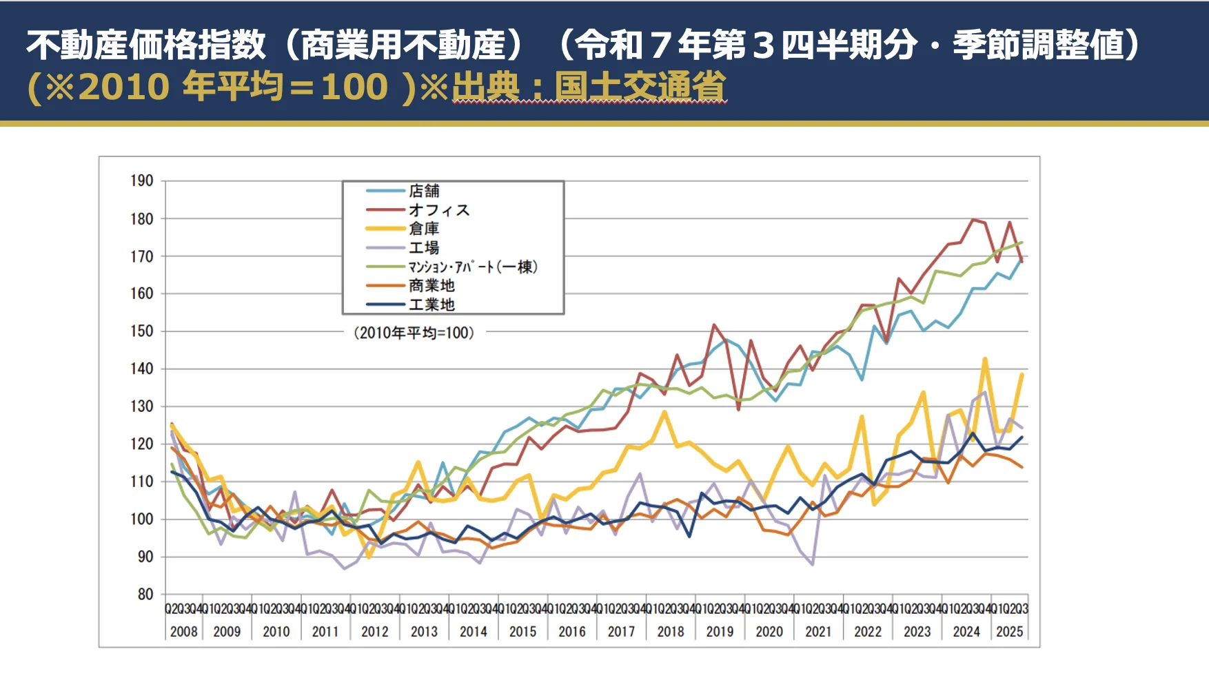 The same logic applies to commercial real estate. The overall commercial real estate index stood at 147.2, up 1.1% quarter-on-quarter, showing a generally resilient trend. However, the stronger segments are not all commercial assets, but rather income-generating categories such as whole apartment buildings and retail properties. Office properties, by contrast, do not show the same clear upward momentum as residential assets.
