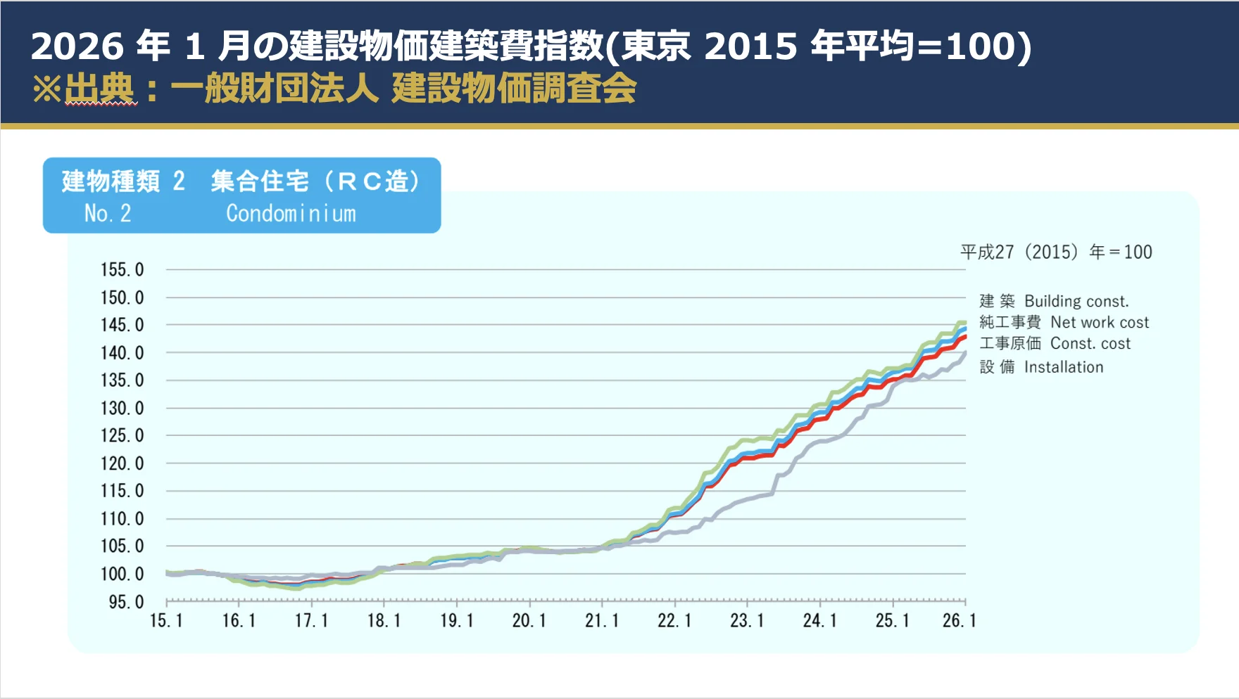What carries the greatest practical significance this month is the change in construction costs and the supply side of the market. According to the construction cost index, reinforced concrete apartment buildings reached 142.9 in January 2026, up 5.8% year-on-year. Compared with the base year, this represents an increase of approximately 43%. Based on a simple estimate, the construction cost per tsubo for RC condominiums is presumed to have risen to around JPY 1.43 million.